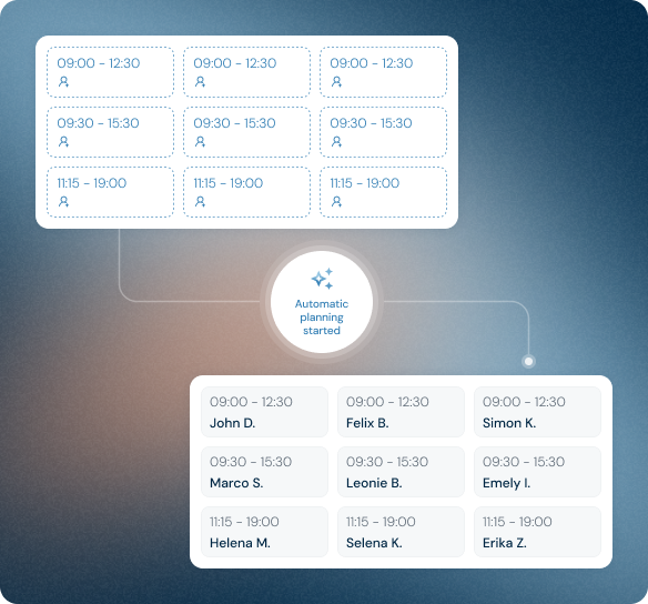 Optimal AI rosters in seconds instead of hours. Based on forecasts, qualifications, and compliance. Everything is automatic and legally secure.
