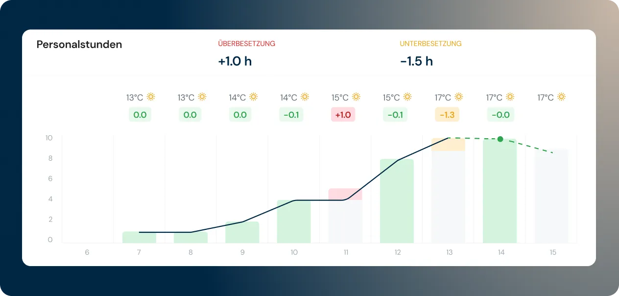 Unsere KI Algorithmen analysieren die Besonderheiten jedes Standorts und schlagen optimale Dienstpläne vor. Das ganze angepasst an Umsatz, Traffic und lokale Muster.
