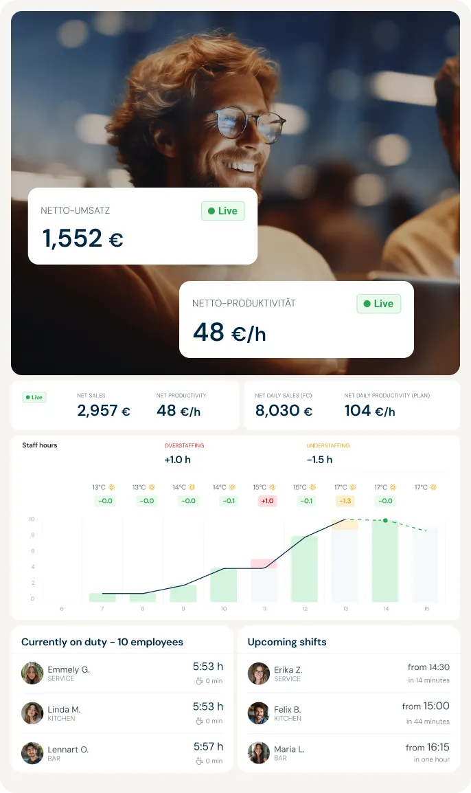 Das Schichtleiter-Dashboard zeigt dir live, was in deinen Standorten passiert: Wer ist im Einsatz? Wie ist die Auslastung? Wo entstehen Engpässe? Performance-KPIs, Servicezeiten und Forecasts auf einen Blick – für schnelle, faktenbasierte Entscheidungen.