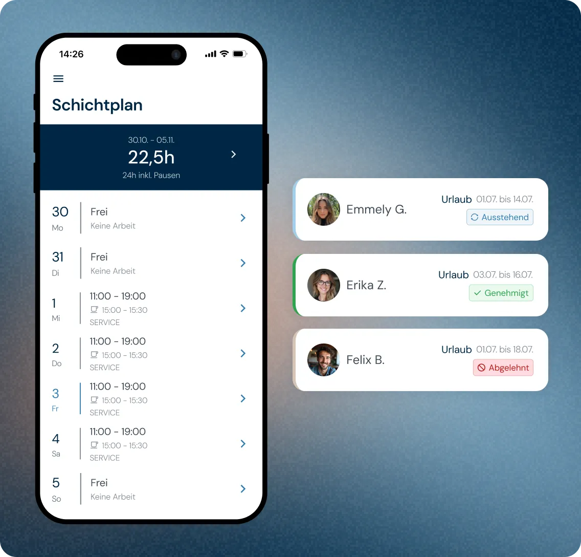 Keine endlosen Gruppen oder Anrufe mehr für Schichttausch. Die Mitarbeiter-App gibt deinem Team den Self-Service: Dienstpläne einsehen, Schichten tauschen, Urlaub beantragen, Zeiten erfassen alles in einer App. Push-Benachrichtigungen halten alle auf dem Laufenden. Du sparst Zeit, dein Team ist glücklicher.